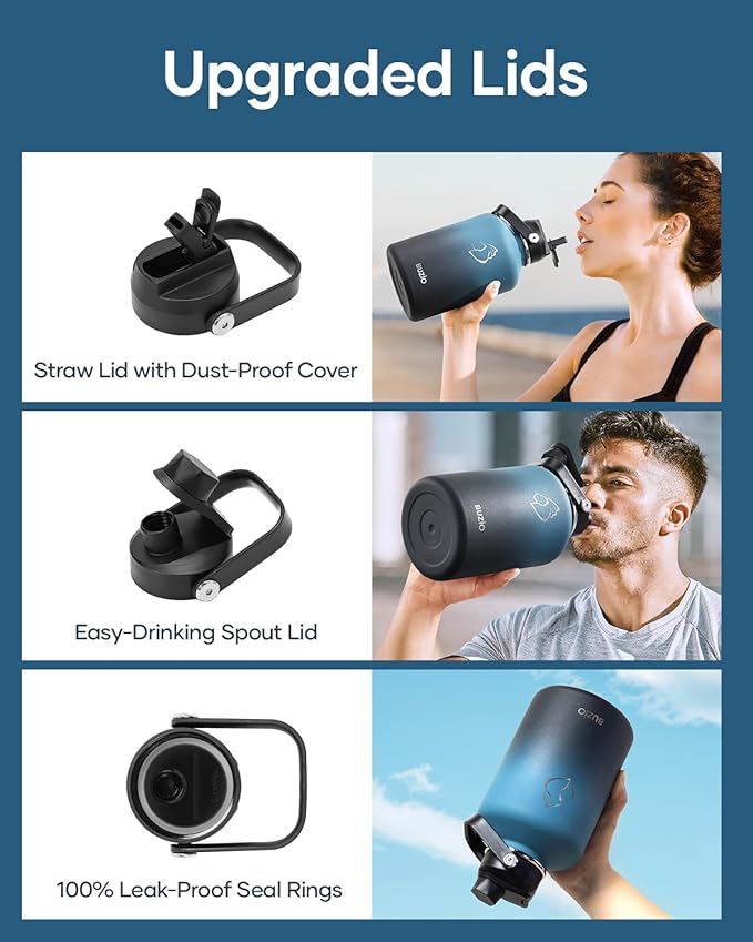 - Upgraded Lids & Handle: This Stainless Steel water bottle features two enhanced lids: a staw lid with dust-proof cover and a easy-drinking spout lid, both equipped with 100% leak-proof seal rings. The reinforced, larger handle offers unmatched durability and portability, making it your perfect on-the-go companion. Also, each lid has a thickened sealing ring, which guarantees 100% leak proof.