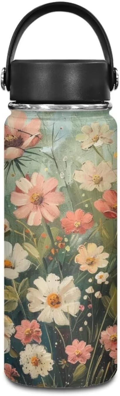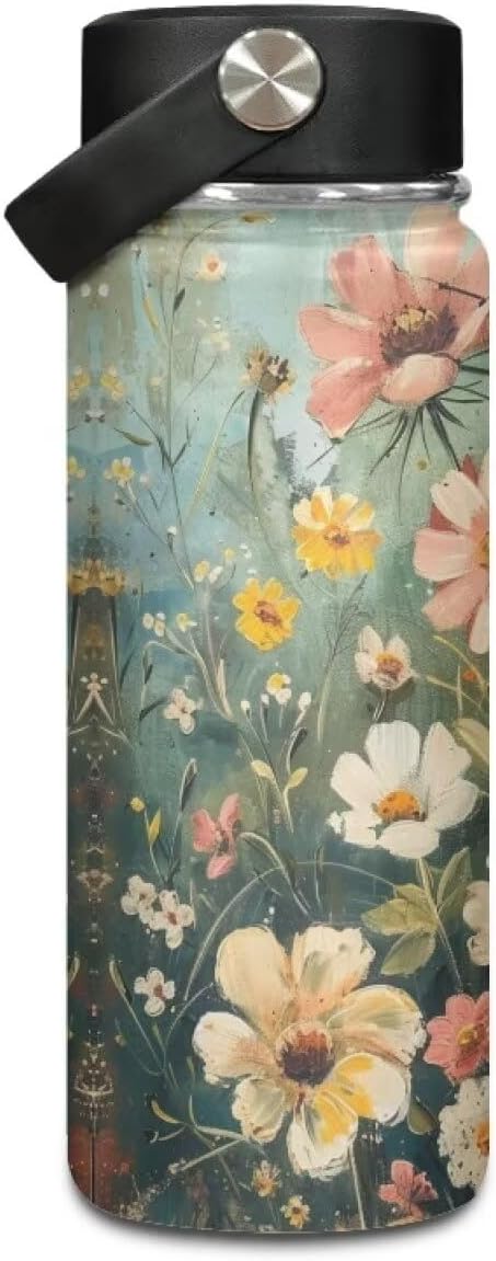 Floral Print Insulated Water Bottle for Women Stainless Steel Sports Water Flask Cup Portable Handle Hot and Cold Water Bottle, 18 Oz