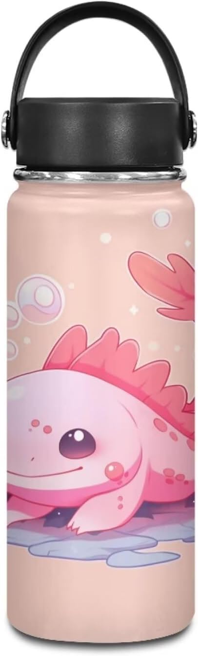 Pink Axolotl Stainless Steel Water Bottle with Handle 18 Oz Vacuum Stainless Steel Reusable Leak & Sweat Proof Gym Sports Travel Water Bottle