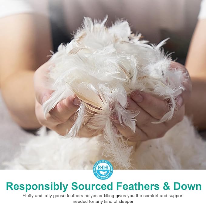 - Triple Chamber Design -- We've filled these fluffy pillows with RDS-certified feathers and luxuriously down-like polyester feels beautifully soft and comfort as your head sinks into it. You'll feel the support of the Feather Down inner chamber, providing gentle resistance to stop your head from sinking too deeply into the pillow for excellent neck support as you sleep