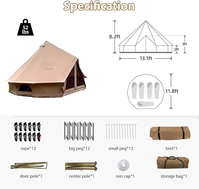 - 【Spacious Space】The bell tent whose diameter is 4m can accommodate 4-5 people. The top height is 8.2ft, and the door height is 5 ft, so that allows you to enter and exit easily and move freely inside without stoop. The diameter of the stove jack is 10cm. You can cut it to size as needed. And the 2ft side wall of the bell-shaped structure allows every space to be used efficiently. You can enjoy the ample liveable space it provides