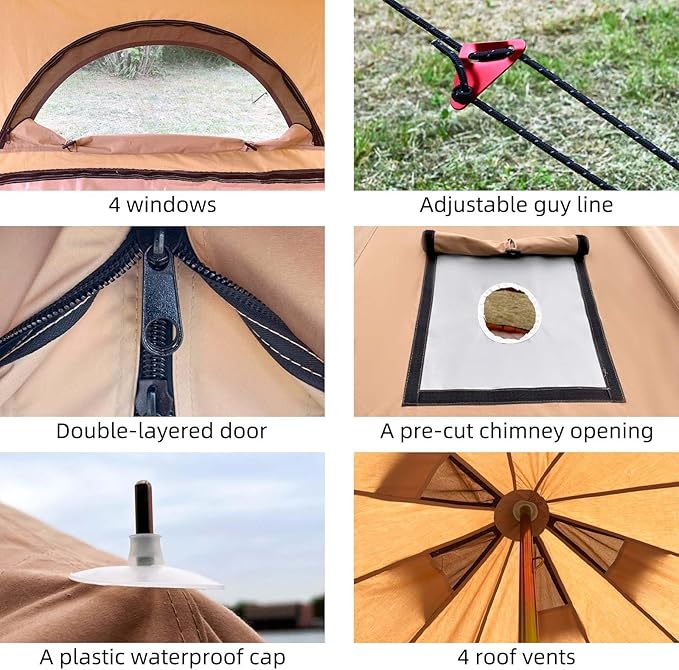 - 【More Designs】①You can easily adjust the tension of the guy line by pulling the tension regulator; ②A pre-cut chimney opening allows you to use the stove in the tent, which can provide extra warmth even on snowy days; ③The tent goes with a plastic waterproof cap on the top of the door pole, effectively prevents rain from leaking through the metal hole