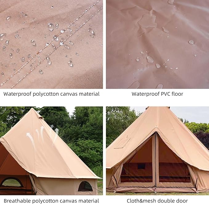 - 【Unique Features】①The polycotton canvas material is durable, water-resistant and UV resistant. But please do not leave it in the rain for a long time, because it does not have PU coating considering breathability; ②The floor is made of heavy-duty and waterproof PVC material which is 500gsm; ③Durable steel center pole ,a triangle door pole and adjustable wind rope can make tent remain stable; ④The door is made of cloth&mesh double material which can ensure ventilation and anti-mosquito
