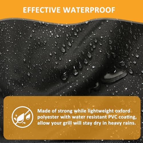 - Material: The waterproof grill cover is made of 600D high-density oxford fabric with an internal PVC coating, can protect your grill from strong winds, storms, sunlight, snow, dust, and debris, durable and long-lasting. Has good UV resistance, color fastness, waterproofing, low temperature resistance, and tear resistance functions.