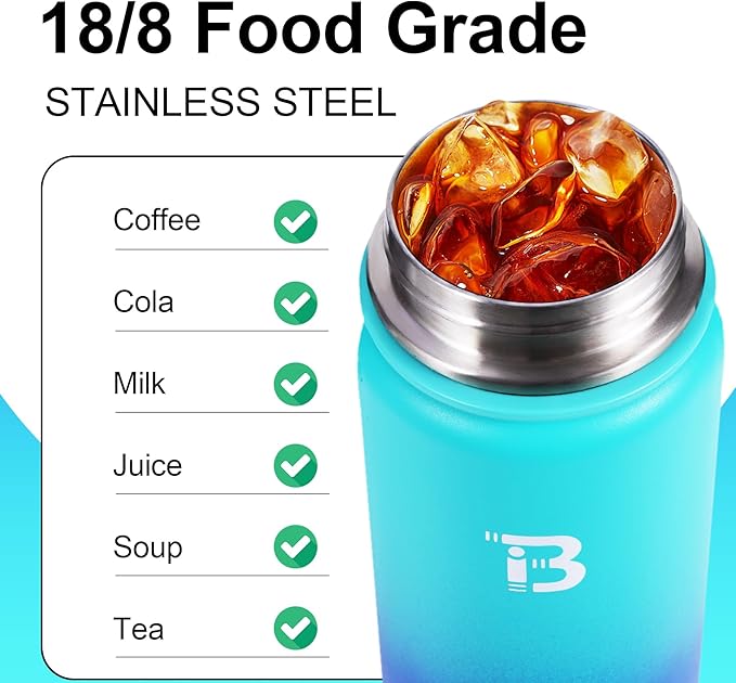 - DOUBLE WALL INSULATION: Our water bottle is made from high-quality 18/8 food-grade stainless steel, rust-proof, BPA-free, lead-free, and easy to wash. This wide mouth water bottle features double-walled vacuum insulation, which can keep your beverages cold for 24 hours and hot for 12 hours with a fresh taste. The wide mouth design is perfect for ice cubes and easy to clean.