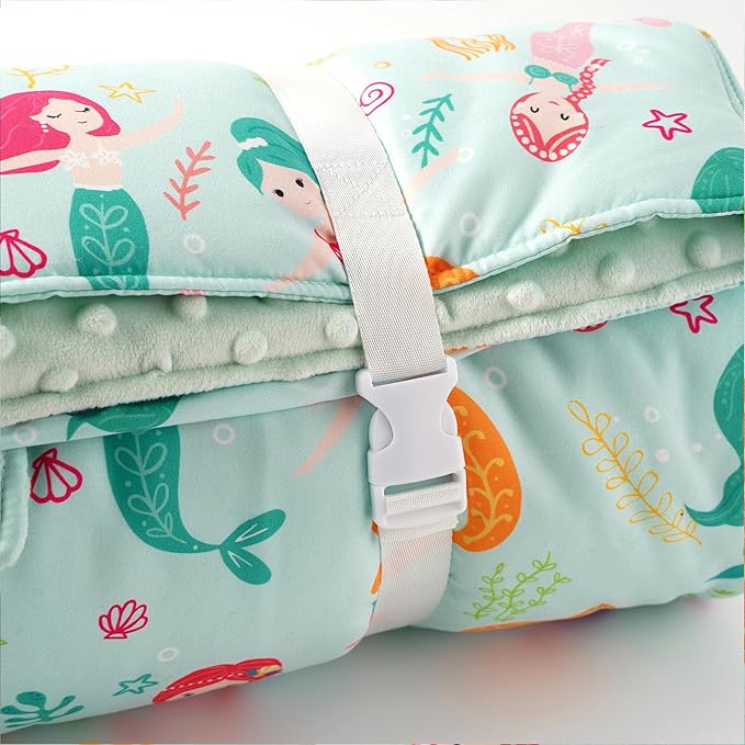 - CONVENIENT FEATURES: Designed to roll-up, velcro close, name card pocket and carry away with a handle, this nap blanket with pillow is easy to carry to daycare, school, on playdates, or on trips. Our padded nap mat is a toddler and baby essential.