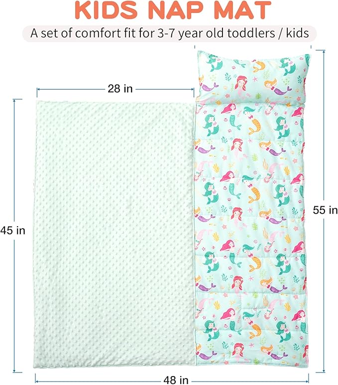 - PERFECT GIFT SET: With a roll-type and foldable storage design, this toddler nap mat with pillow becomes an essential companion for daycare, kindergarten and preschool. This nap mat is also suitable for family outings, camping trips, picnics, and more, ensuring convenience and style wherever the adventure takes them.