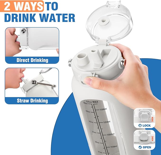 - Glass Water Bottle with Straw Lid: Our 64 oz glass water bottle, furnished with a convenient straw lid, showcases an innovative and fail-safe design. Its pioneering one-click button system simplifies the drinking process—just a gentle press and the lid opens automatically, ensuring a hassle-free experience.