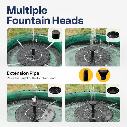 - MULTIPLE WATER PATTERNS: The 6.3-inch diameter VIVOHOME solar-powered fountain pump requires no battery or additional power supply and works better with more sunlight; It activates within three seconds when exposed to sufficient sunlight and automatically shuts off when no water is in the basin; The combo has four nozzles that can be changed to create different spray shapes and heights from 3.9 to 19.7 in; The recirculating water spray can last three to five days, eliminating the need for frequent water addition