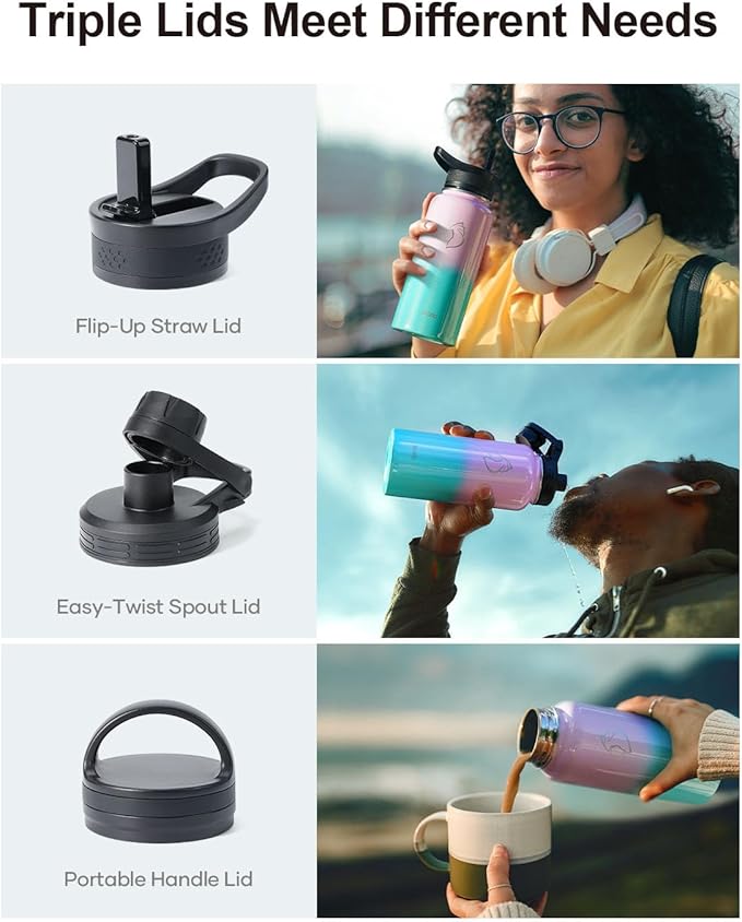 - Super Deal Combo: Buy 64oz insulated water bottle, get 7 accessories. The pack includes 1 x carrying pouch, 3 x lids, 2 x straws, and 1 x straw cleaner. This bottle is ideal for camping, hiking, cycling, running, gym sessions, or outdoor work, ensuring you stay hydrated wherever you go.
