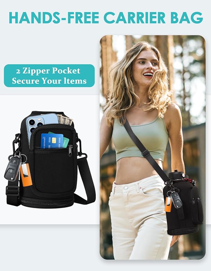 - HANDS-FREE BOTTLE CARRIER BAG & PROTECTIVE BOOT - Stainless steel water bottles with shoulder strap carrier have 2 zipper storage pockets hold your phone, cards, keys. The carrying pouch also provide extra insulation, with the silicone cup mat full-protect the reusable water bottle from additional damage and extend the life of thermo hydro mug