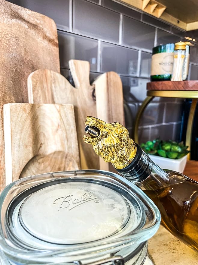 - WINE, LIQUOR, & COOKING OILS - A great areator stopper and pourrer for a variety of bottles that include any type of alcohol, Whiskey, vodka, gin, and tequila bottles are a great fit. Don't forget the elegance added to cooking oil bottles such as avacado, olive, and other kitchen liquids. Great for lion or animal lover gift.
