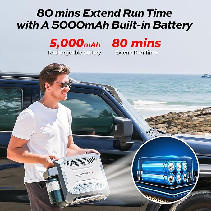 - 【Refreshing Showers Anytime & Anywhere】InstaShower GO comes with a built-in 5000 mAh rechargeable battery, which can operate 80mins, allowing you to enjoy refreshing showers even in remote locations without access to electricity.What if you forget to recharge it? Take it easy. It can be connected to a car or a portable power station, ensuring usability anywhere.