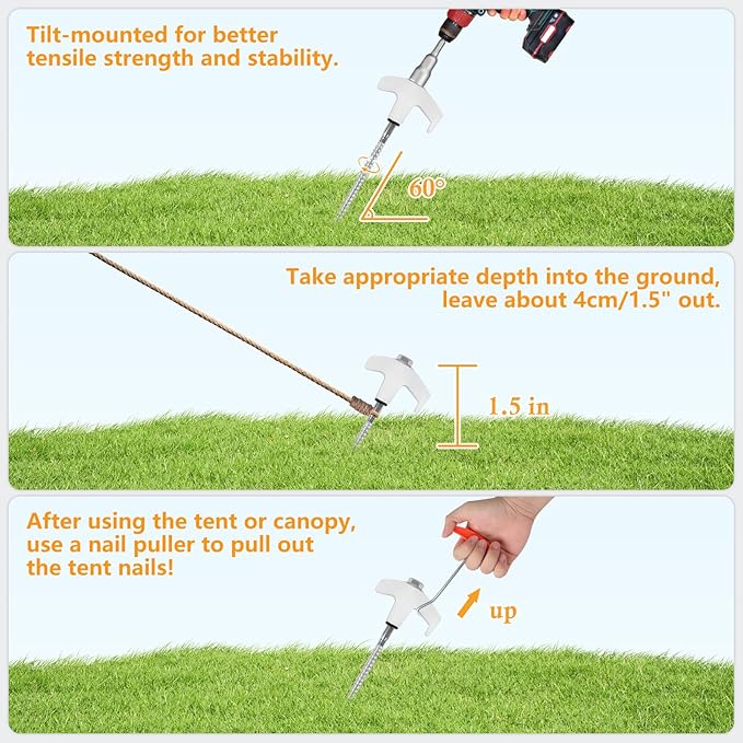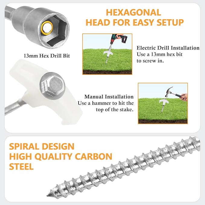 - ๐งฐ๐ ๐ฅ๐๐ฑ๐ข๐๐ฅ๐ ๐๐ง๐ฌ๐ญ๐๐ฅ๐ฅ๐๐ญ๐ข๐จ๐ง - Considering the convenience of using screw tent pegs, we provide right tool accessories for installation. Equipped with 1 power-driven 13mm drill bit, you can use a drill tool to easily drive the stakes into the ground. Or use a hammer tool for installation. The spiral structure of the metal threaded tent spike provides a stronger grip.