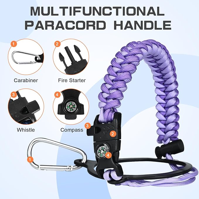 - Full-function Paracord - With brilliant matching colors brings a touch of youthful vibe to the 40 oz water bottle. As a sturdy survival handle it comes with a carabiner, compass, fire starter and whistle, perfect for your wild adventures hiking camping fishing.