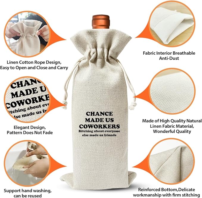 - PREMIUM MATERIAL: Our funny wine bag is made of high-quality cotton linen material fabric, printed double-sided, odorless, smooth appearance, durable and reusable. At the same time, it has very good quality and safe enough to protect or hold wine or champagne bottle.