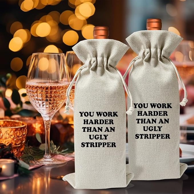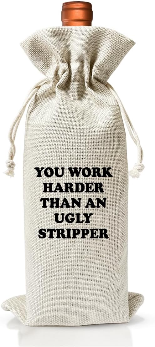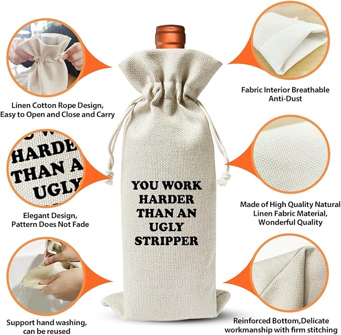 - PREMIUM MATERIAL: Our funny wine bag is made of high-quality cotton linen material fabric, printed double-sided, odorless, smooth appearance, durable and reusable. At the same time, it has very good quality and safe enough to protect or hold wine or champagne bottle.