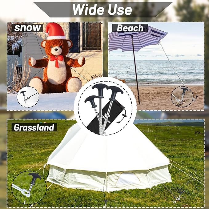 - SUITABLE FOR MULTIPLE SCENARIOS: In addition to being used to secure tents, awnings, tarps, rope stands, fences, awnings and beach umbrellas, these Ground stakes can also be used to secure a child's trampoline, to support stationary plants and to secure a large Christmas balloon.