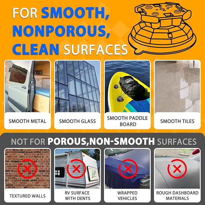 - WARM TIPS: The strong suction cups with hooks can be used on smooth, flat, and polished surfaces. To ensure the best grip, please keep the suction cup anchor and the suction surface clean and make sure that there are no grooves under the suction cup. Small grooves will reduce the suction power.