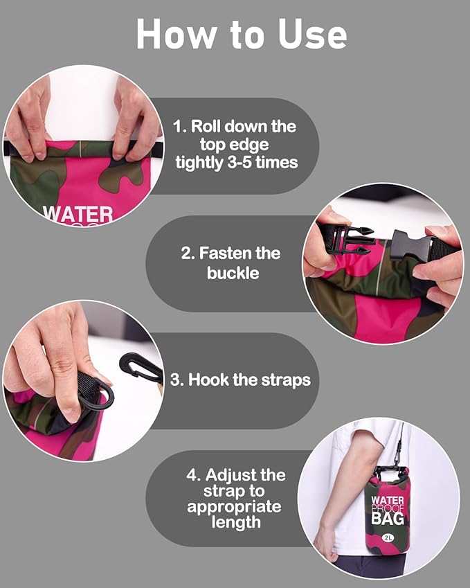 - Waterproof: Made from durable, waterproof material, the 2L camo roll top bag ensures your items stay dry in any wet environment. The roll-top closure provides a secure, watertight seal. The zippered wet bag with one pocket is suitable for protecting contents from either getting wet or the wet contents leaking out, which is more made for keeping a wet swimsuit, gym clothes, diapers, etc.
