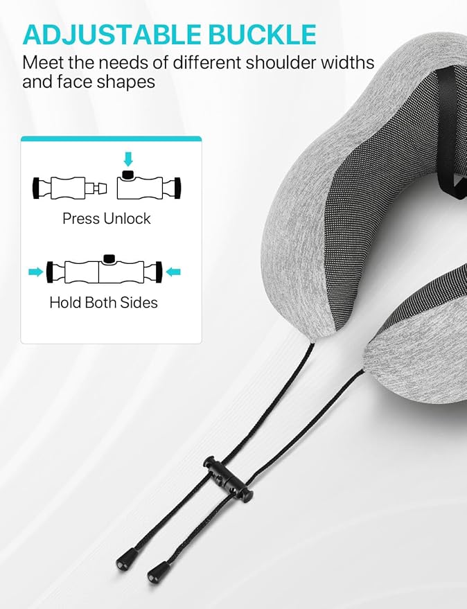 - Adjustable Eye Mask and Easy Setup: Equipped with 2 adjustable buckle straps, this neck pillow suits individuals of different heights;The included eye mask ensures your head remains stable during travel, providing a stable and comfortable sleep environment;Set up is a breeze, so you can start relaxing right away
