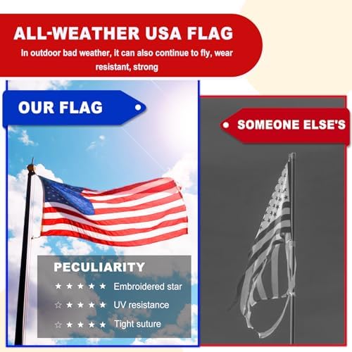 - Waterproof Uv Protection Coating Us Flag:The 4 x 6 outdoor American flag is specially treated with a waterproof coating and UV resistant coating that allows the American flag to dry quickly, and even after prolonged exposure to the hot sun, USA flag has a vibrant color that keeps the US flag in good condition in any weather and free to fly outdoors all year round