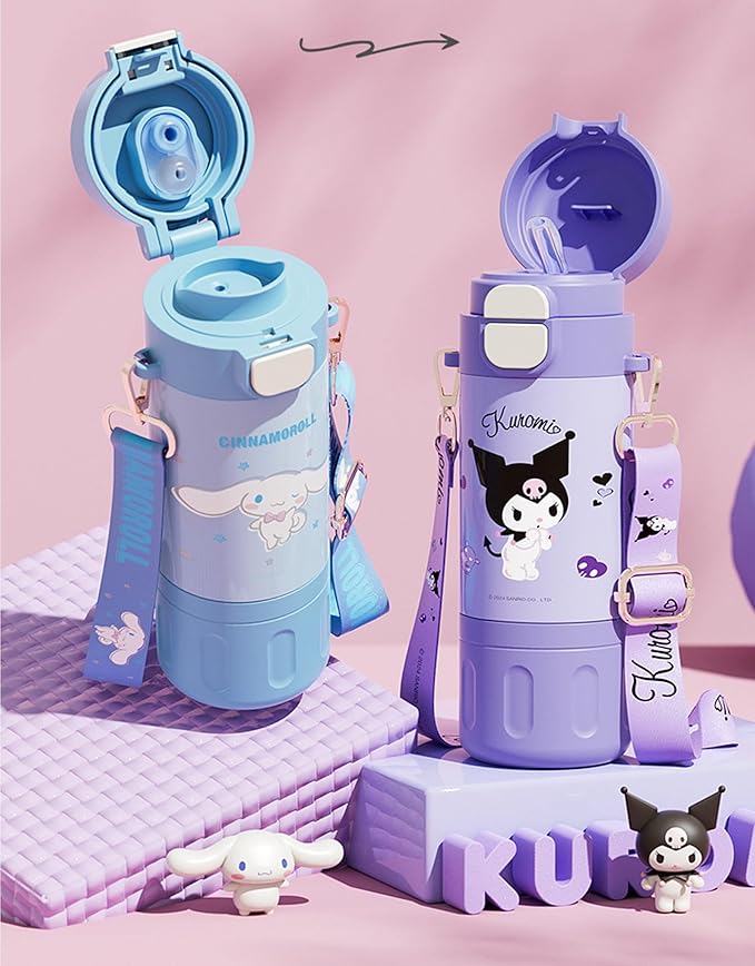 Kuromi Stainless Steel Insulated Water Bottle with Strap (Spout & Straw) 480ml - Purple