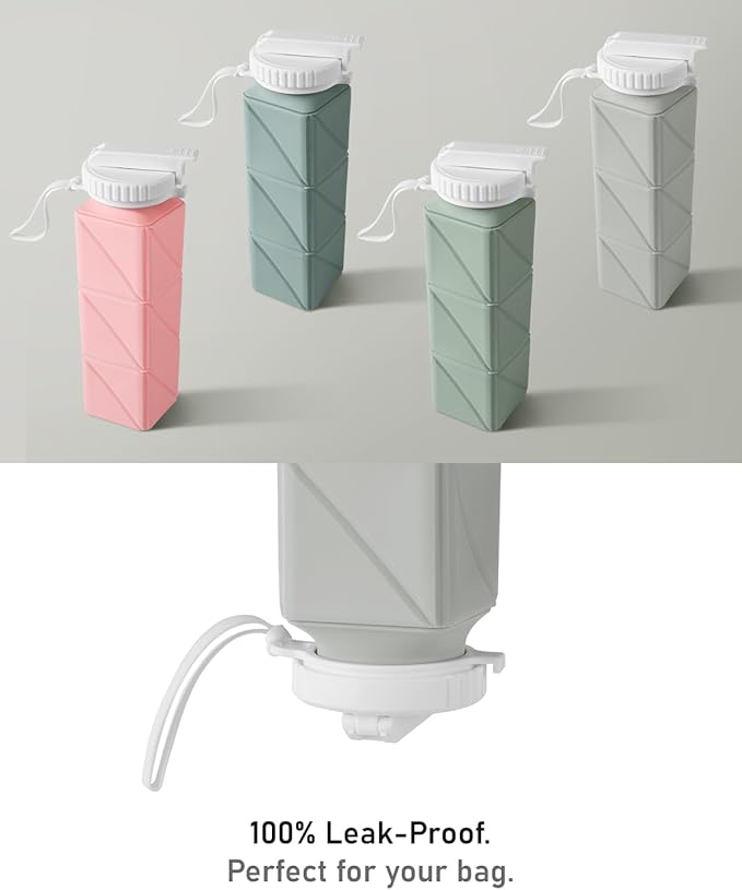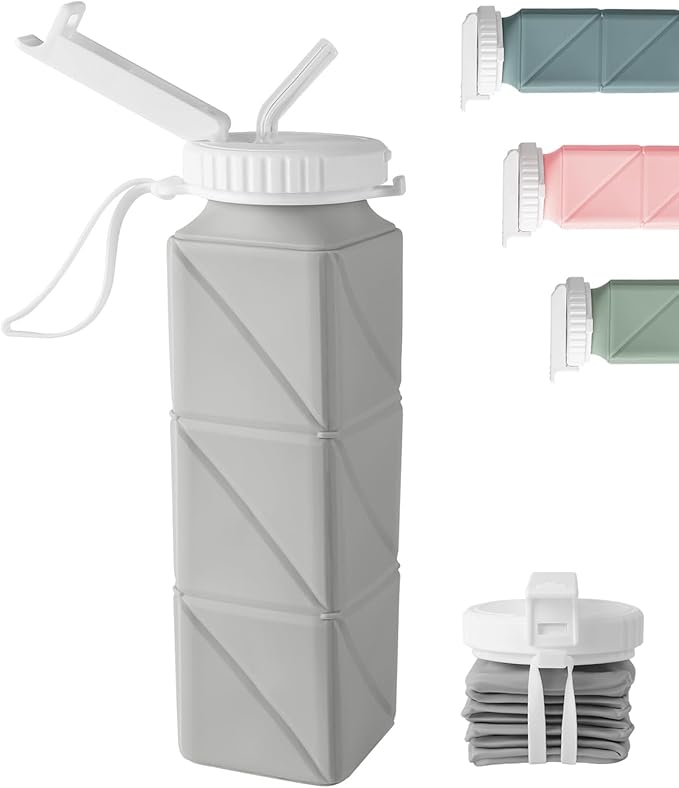 Opard Collapsible Water Bottles 21 Oz - BPA Free, Leak Proof, Foldable Silicone Collapse Water Bottle with Straw, Easy to Compact and Expandable, Travel Essentials Accessories (Grey)