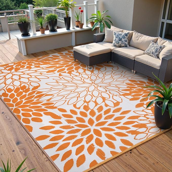Anidaroel Outdoor Rugs 8x10ft for Patios Clearance Waterproof, Reversible Tropical Plastic Straw Camping Mat Outside Rug, Large Outdoor Area Rug for RV, Deck, Balcony, Picnic(Orange,8'x10')