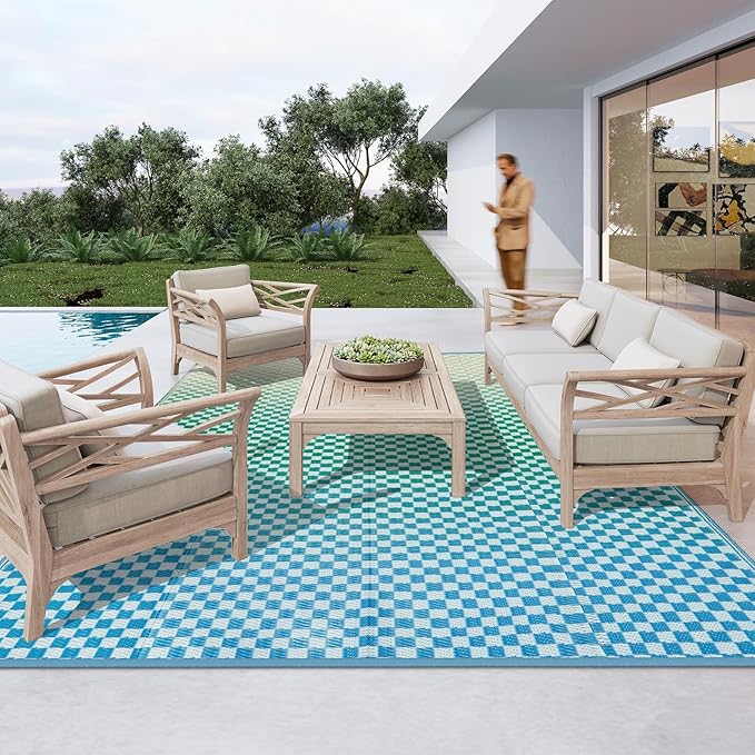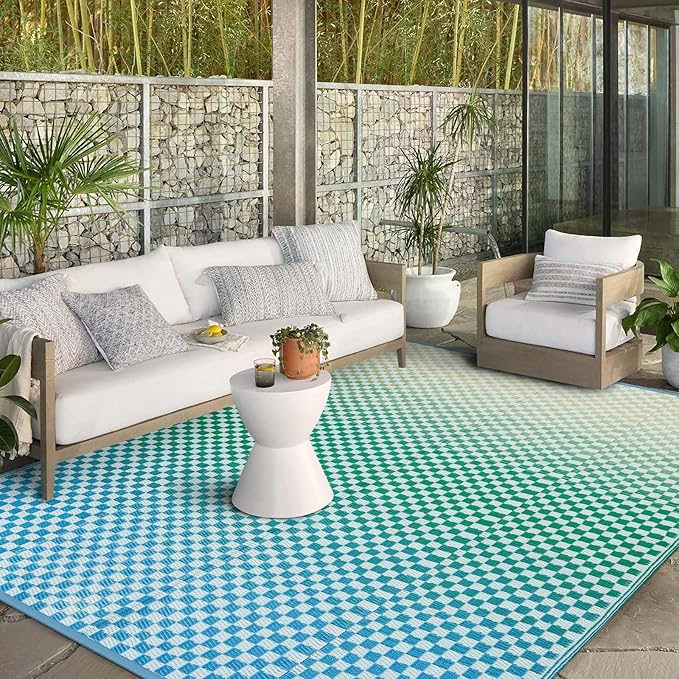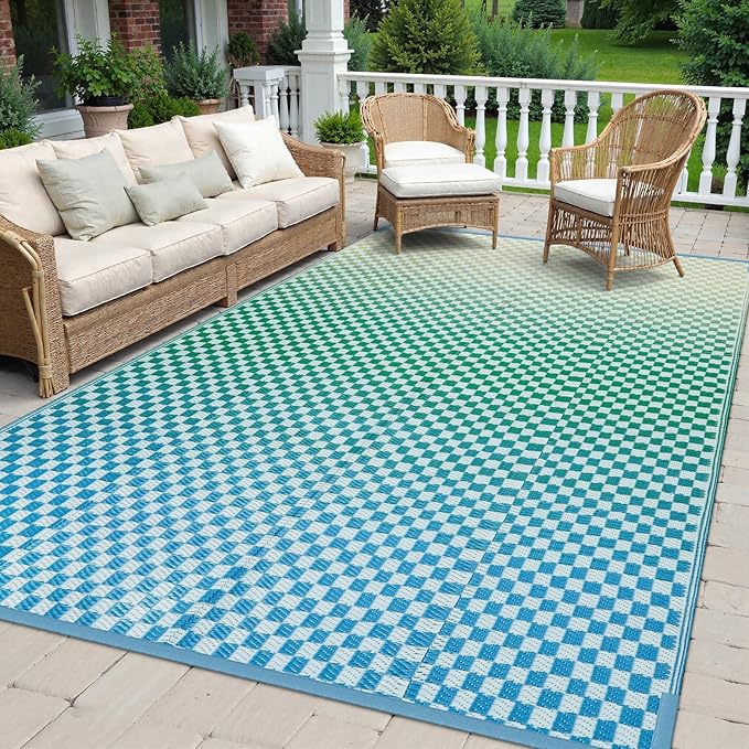 - [Eye-Catching Reversible Mat] Our reversible patio rugs feature a special gradient design. The grid structure produces color nuances that give a sense of space and movement, bringing visual appeal to your area while offering more possibilities for pairing