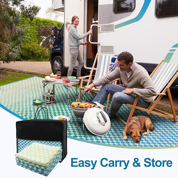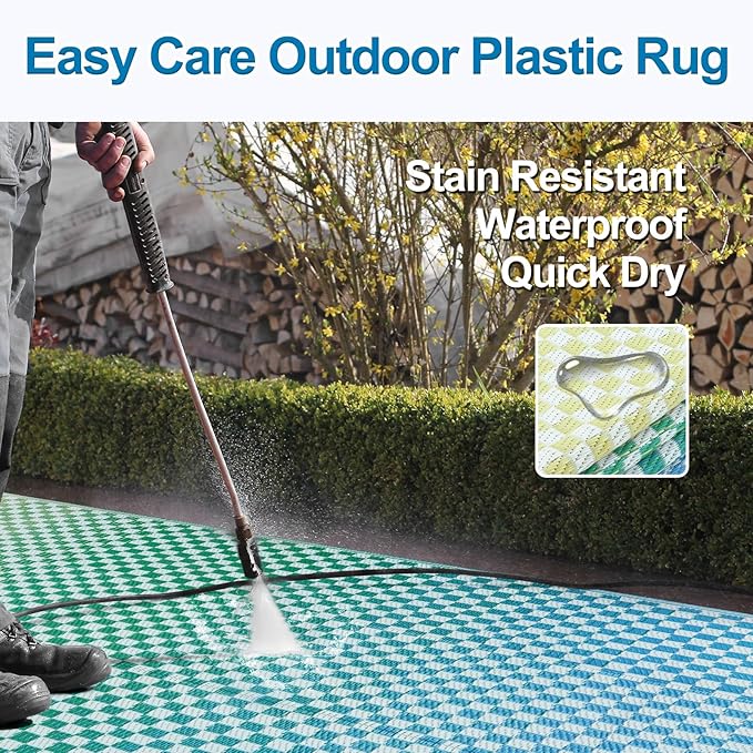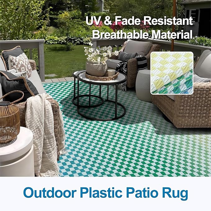 - [Versatile Outdoor Rug] The large outdoor rug is woven from a breathable, comfortable plastic material that won't damage your deck or lawn. Ideal for patio, deck, garden, backyard, balcony, camping, picnics, tent, RV road trips, beach and indoor rooms