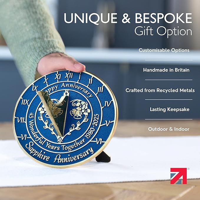 - HANDMADE IN THE UK - With high quality thick Brass, our craftsmen combine simplicity, elegance and durability into every single sundial. And for this 45th wedding anniversary version, they finished it in blue. Some may say it’s a bold choice, we say a well-deserved choice. After all, 45 years is something to shout about.