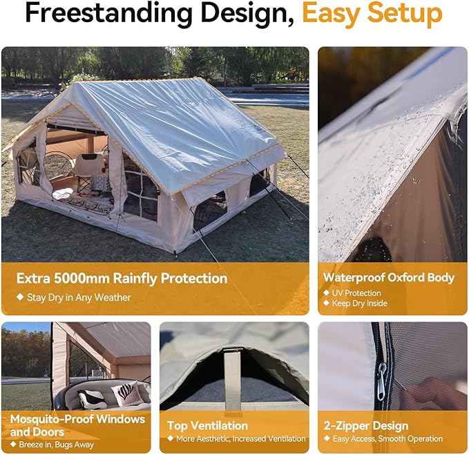 - 【Upgraded Large Rain Canopy】Equipped with an oversized rain canopy, this inflatable tent provides extra outdoor space for cooking, relaxing, or sheltering from the rain. It enhances the functional area and is an ideal addition for outdoor enthusiasts seeking extra convenience and protection.