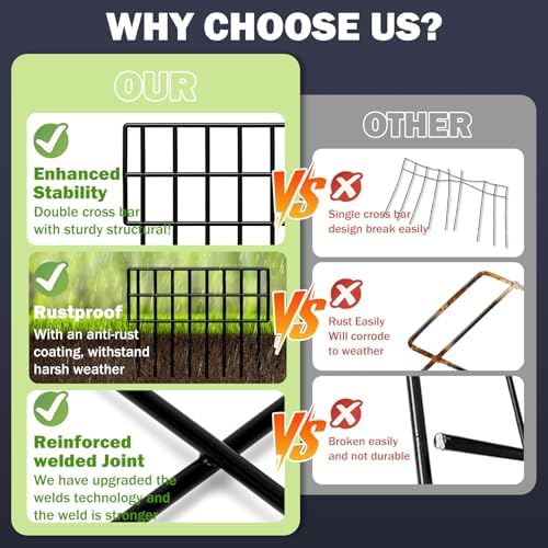 - Sturdy& Durable :A unique design with a cross bar in the middle enhances the fence's stability and durability.The garden fence animal barriers are constructed from heavy-duty metal with an anti-rust coating, making them resistant to corrosion and adverse weather conditions, ensuring long-term durability.