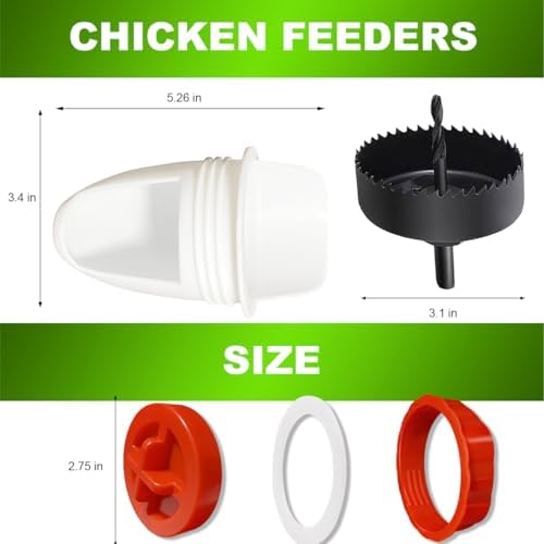 - EASY TO INSTALL:The poultry feeders for chicken come with 1 hole saw;Drill holes on the bucket and insert the ports,tighten with screw on bushings to be ready. Any container that is convenient can be easily transformed into an automatic chicken feeder