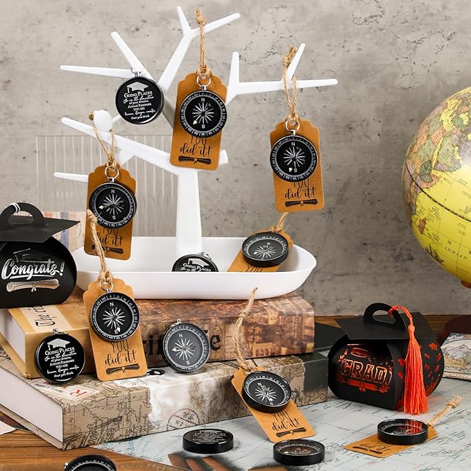 - Inspirational Graduation Compass Gift Set: each package includes 24 mini compasses, each in a beautiful black color, and corresponding 24 'You Did It' sign tags expressing heartfelt congratulations; A roll of rustic jute rope is included for attaching the tags, enough to meet your graduation party needs, offering a complete set for a nice gifting experience