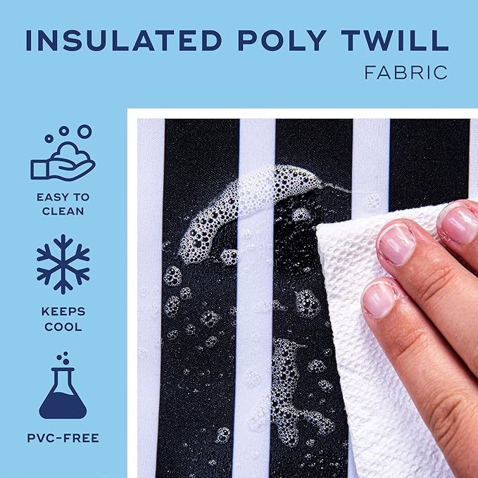 - Keeps Contents Cool And Cleans Up Easy: The three-layer insulated fabric features a water-resistant exterior, foam-insulated middle, and a heat-sealed, food-safe (PVC-free) liner that won't leak. Add ice and go! Spills wipe clean inside and out