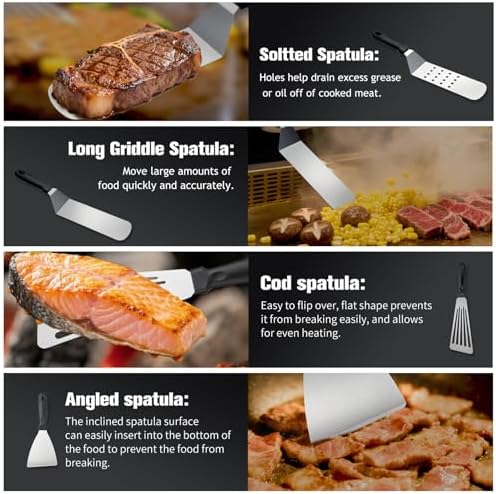 - 【Commercial-Grade Build for Everyday Use】Designed to withstand high heat without bending or rusting, our griddle tools are built for serious durability. The extended handles offer a safe and comfortable grip, while the well-balanced spatulas give you better control when flipping eggs, steaks, and more. Each tool features reinforced joints for long-term strength, making this set ideal for everyday cooking or weekend BBQ parties.