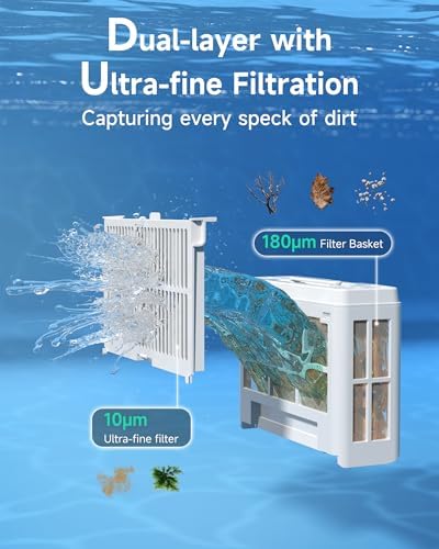 - Double Filtering For Ultimate Cleaning: Introducing a new generation of pool cleaning technology, C2 pool cleaner is equipped with two advanced filtration baskets designed for different sizes of debris. The first filter basket features a fine mesh of 180μm to effectively intercept leaves and other large particles of trash, while the built-in ultra-fine filter specializes in traps dust and other tiny particles minimize to 10μm to ensure crystal clear water