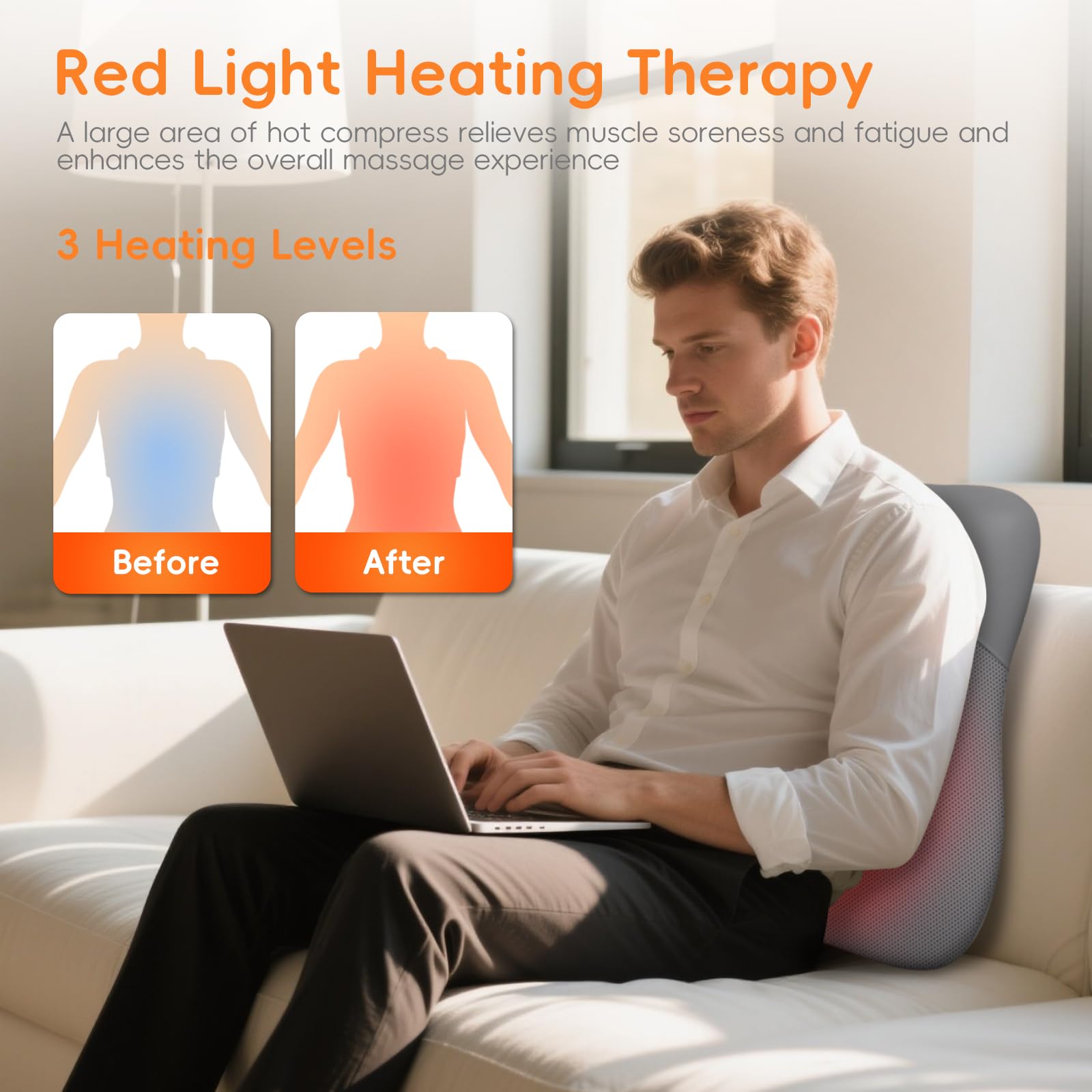 - 【3-Level Red Light Therapy】Red Light Therapy back massager with heat penetrates 1.2' into muscles (50%deeper than standard heat pads). This shoulder massager with 3 warmth settings, it boosts blood circulation 40% faster - ideal for fibromyalgia, arthritis, targeting back pain relief, office fatigue, or post-workout recovery. Clinically proven for muscle relaxation.