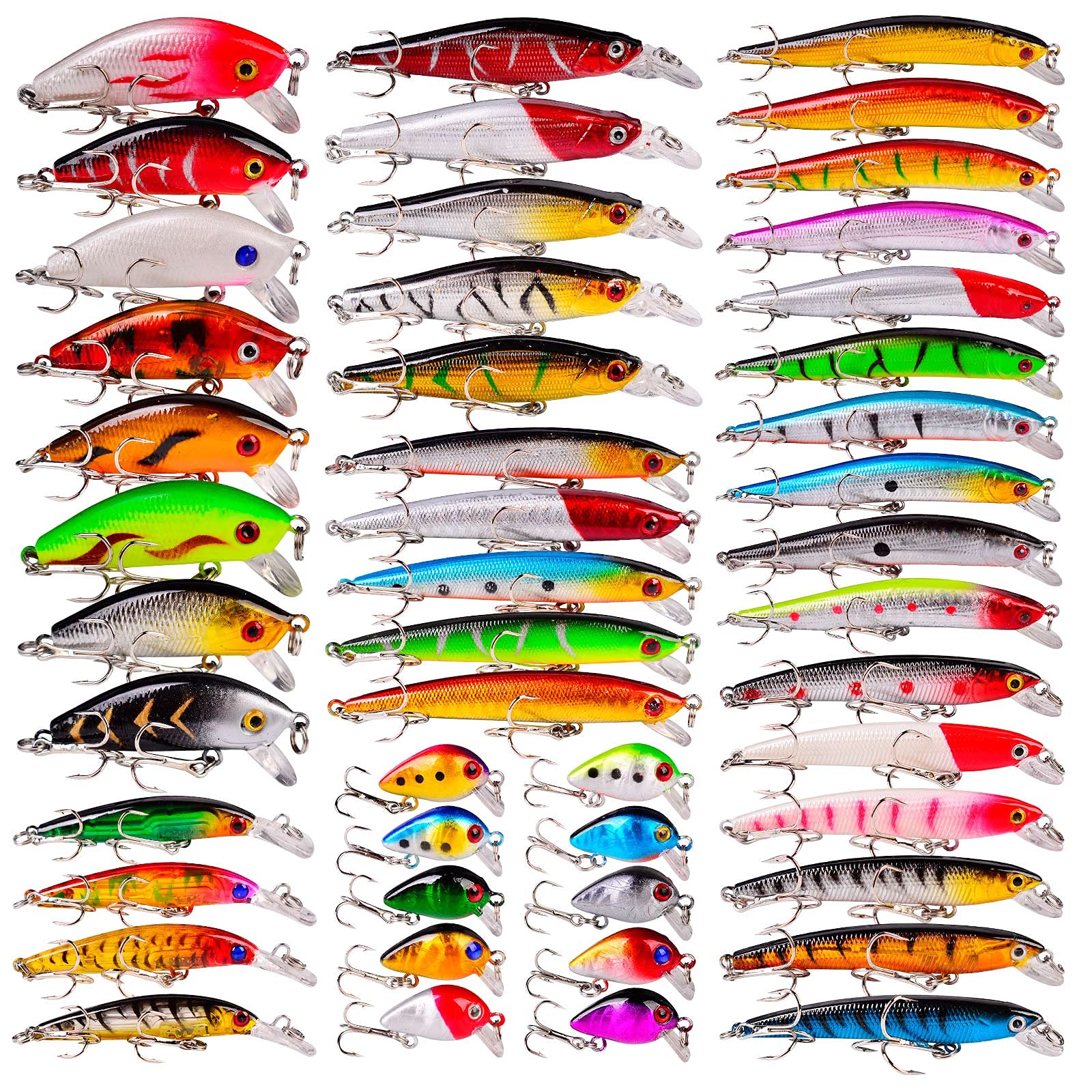 Details: Baikalbass 48pcs Fishing Tackle Set With vibrant colors and patterns, the Minnow bass draws curious predators right in to the end of your line. Utilizing its lip and body design, this lure performs a tight wobble action that is certain to trigger explosive strikes. Specifications Total Quantity: Pack of 48pcs Hard Lures Set Details: Double Stronger Flat Rings Styles of Hooks: Sharp and High Penetration Hooks Features Minnow Lures 1-10pcs: Length: 10cm-3.94in Weight: 8.53g-0.3oz Hooks: 6# High Carbon Steel Treble Hooks Minnow Lures 2-5pcs: Length: 8.5cm-3.35in Weight: 8.4g-0.3oz Hooks: 6# High Carbon Steel Treble Hooks Minnow Lures 3-5pcs: Length: 8.5cm-3.35in Weight: 6.23g-0.22oz Hooks: 6# High Carbon Steel Treble Hooks Minnow Lures 4-6pcs: Length: 7.5cm-2.95in Weight: 4.69g-0.17oz Hooks: 6# High Carbon Steel Treble Hooks Minnow Lures 5-4pcs: Length: 7cm-2.76in Weight: 3.8g-0.13oz Hooks: 8# High Carbon Steel Treble Hooks Crankbait 1-8pcs: Length: 5cm-1.97in Weight: 3.9g-0.14oz Hooks: 10# High Carbon Steel Treble Hooks Crankbait 2-10pcs: Length: 2.6cm-1.02in Weight: 1.9g-0.07oz Hooks: 10# High Carbon Steel Treble Hooks Package Information Pack of 48pcs Mixed Color and Size Fishing Lures Kits Note The Hook Is Extremely Sharp. Please Take Care For Handle It.