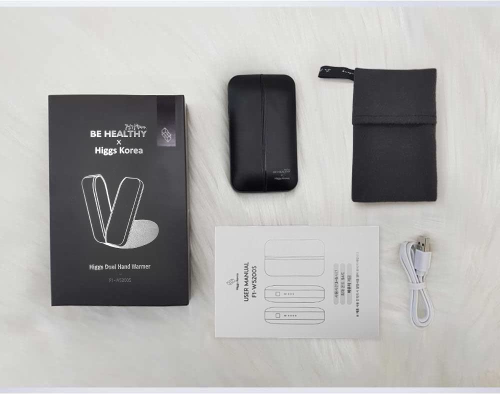 Details: [Separable 2-in-1 Hand Warmers] BE HEALTHY X HIGGS 2-in-1 hand warmers are made of High-tech aircraft-grade aluminum and ABS material. Anti-scald, Anti-skid, Explosion-proof, Radiation-free. You can split them into two hand warmers to share with others, or put them in each pocket to warm both your hands. [Fast Heating & 3 Heat Settings] Heats up fast in 3 seconds. Takes just 60 seconds to reach maximum temperature. Dual sided heat up to 129°F/54°C operating temperature with 3 heat settings for adjustable and comfortable warmth. Battery and heat indicator lights will show you the selected heat settings and battery remaining. [5200 Large Battery Capacity] Rechargeable 5200mAh lithium-ion battery for long lasting, reliable warmth up to 6 hour run time. [Portable Hand Warmers] Sleek, compact design, with a smooth textured finish. Pleasant to the touch. Ideal size for your hands. Perfect for carrying anywhere in any pockets or bags while sporting, fishing, hiking, camping, skiing, to quickly warm your hands BE HEALTHY rechargeable 2-in-1 hand warmers is a perfect gift for your family, friends, and lovers for all cold, winter weather activities. Be Healthy x Higgs Korea Dual Hand Warmer Features a split design. Separates into two bodies one for each hand. Attaches together using magnetic charge terminals. Three (3) Heat settings up to 129°F/54°C Battery and heat level indicator. Rechargeable 5200mAh Li-ion battery for reliable warmth up to 6 hours. Charges through USB-C. Sleek aluminum body design. Storage pouch included.