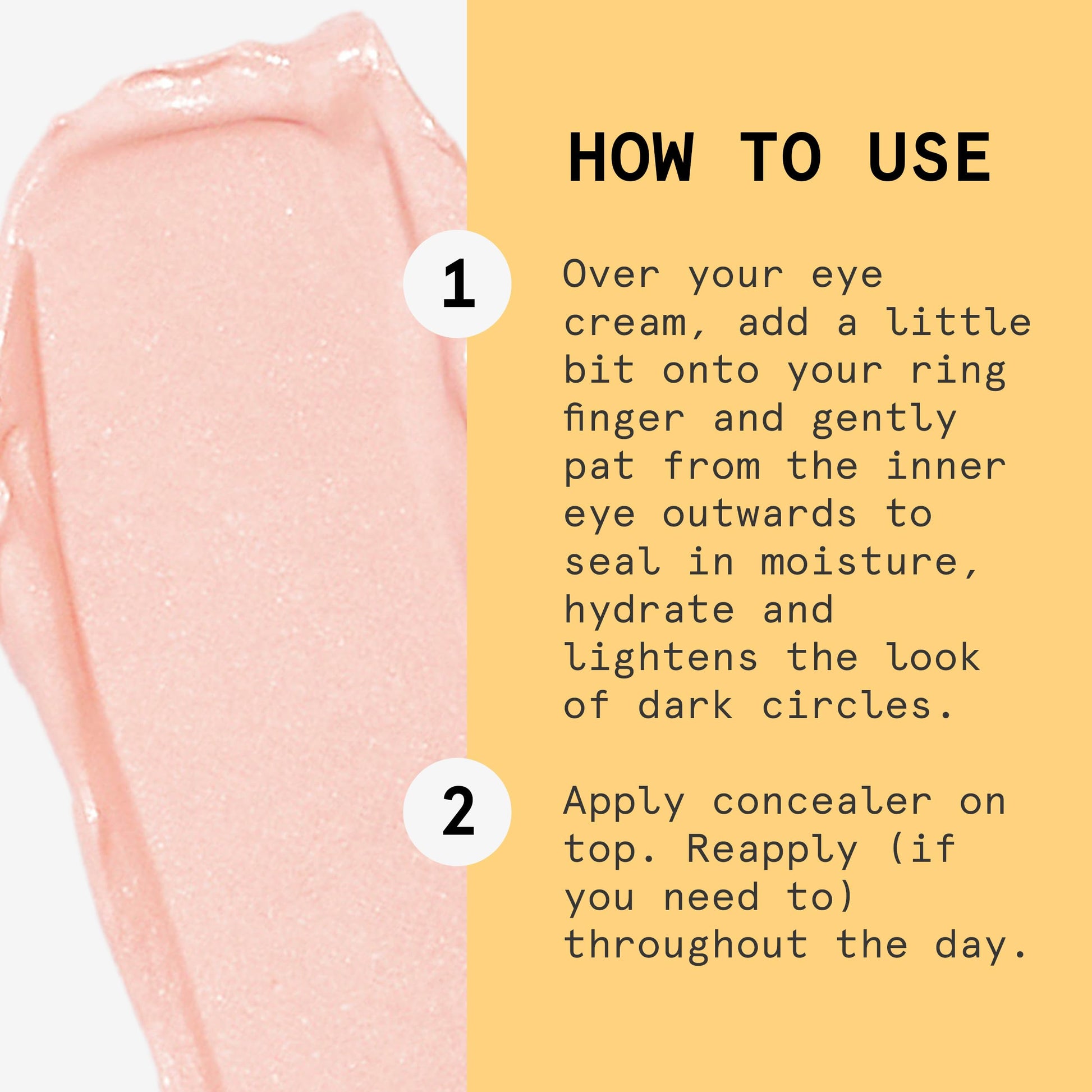 - How To Use: Over your eye cream, add a little bit onto your ring finger and gently pat from the inner eye outwards to seal in moisture and hydrate look of dark circles. Apply concealer on top. Reapply (if you need to) throughout the day. Suitable For: All skin tones with brown-toned dark circles.