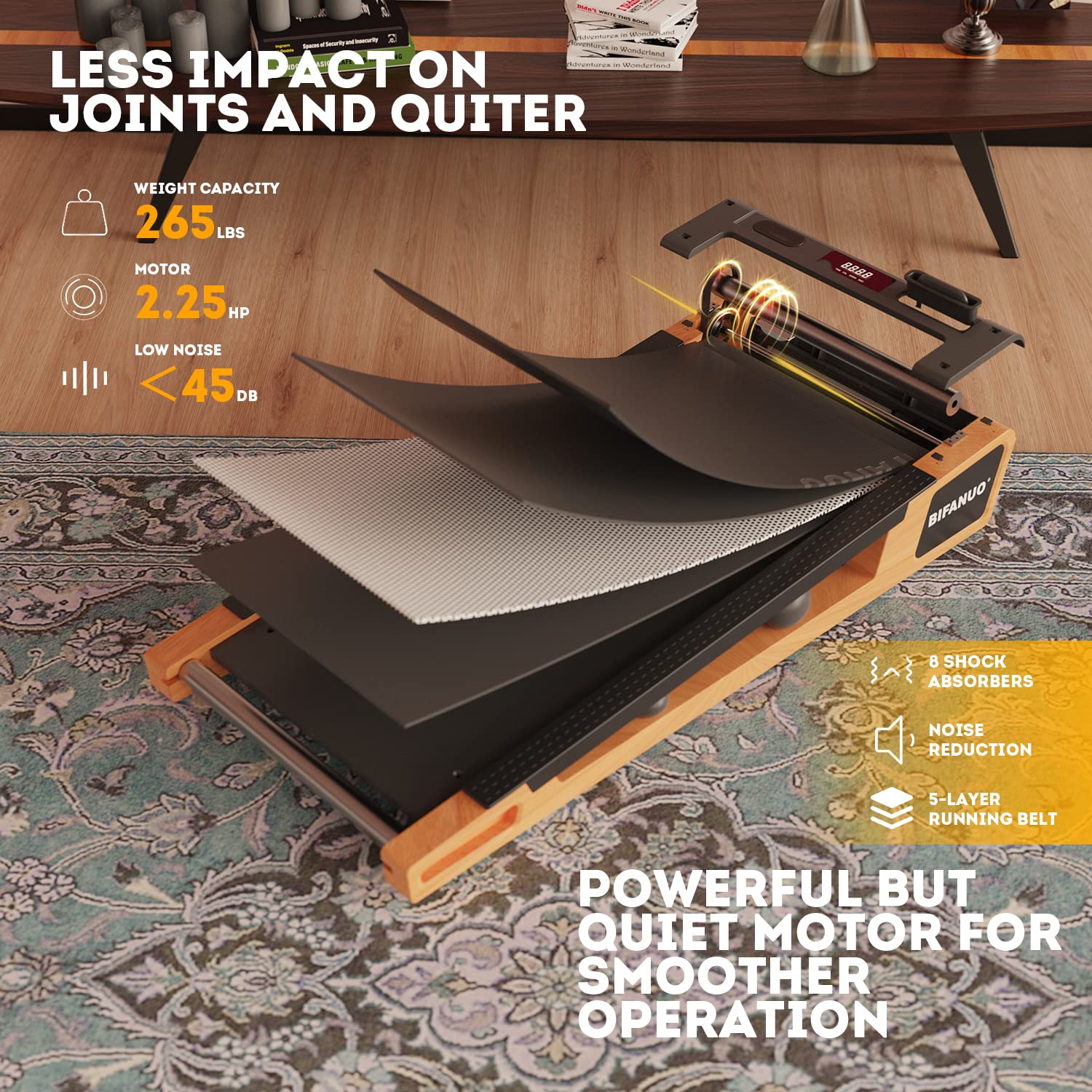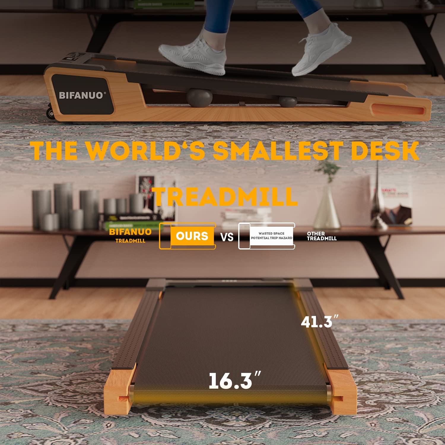 - 【UNDER THE DESK TREADMILL FITS ANY SPACE】5-layers anti-slip running belt, 265-pound user capacity, 41.3L x 16.3W inches running belt, treadmill size: 43.7L x 21.3W x 7.2H inches, can be put under your desk, living room, small department, bedroom and office; Easy to move with the built-in wheels.