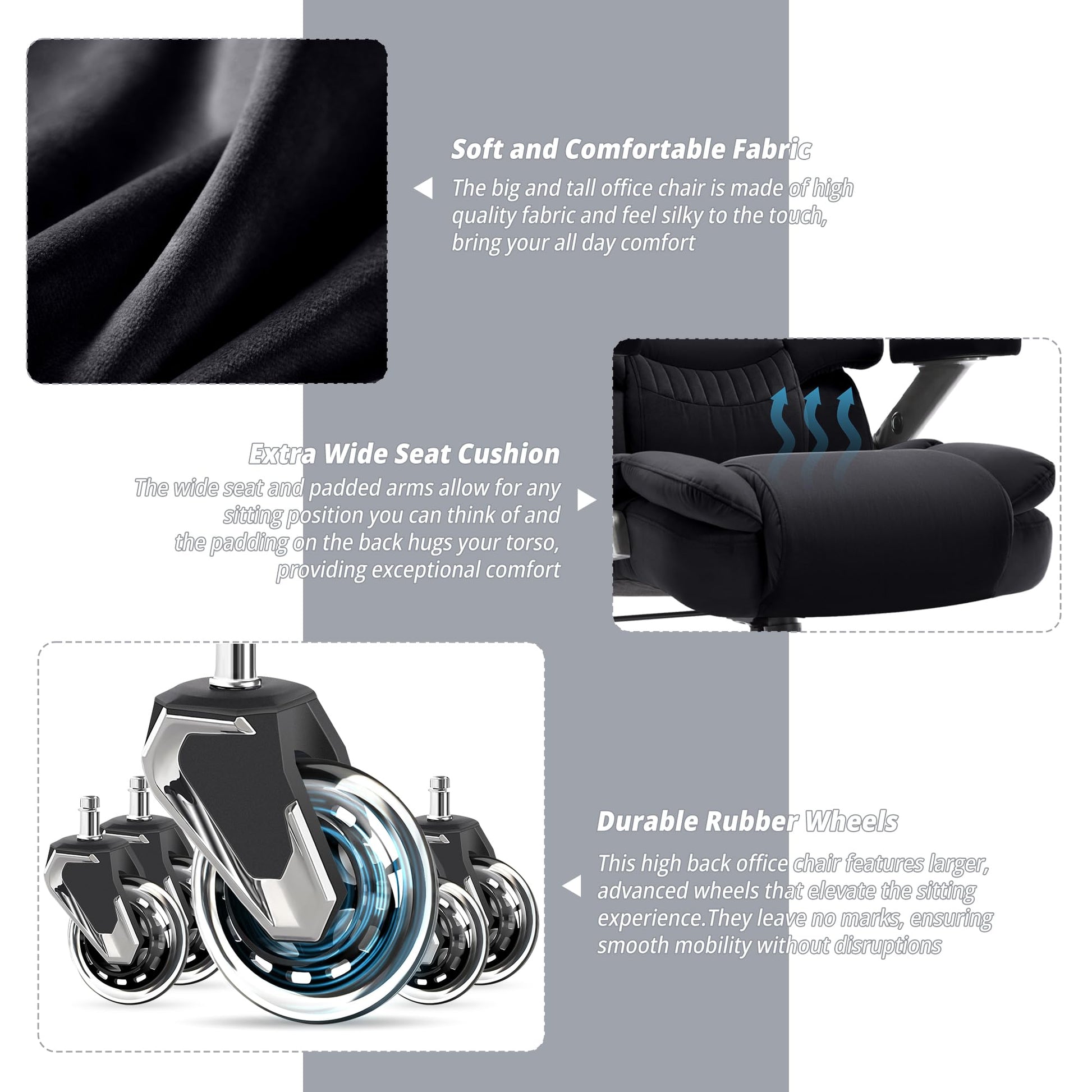 - Made of Soft and Skin-friendly Fabric: The executive office chair is made of a luxurious fabric that has been cherished by many people for its soft texture and rich appearance, which feels wonderful to the touch. The appeal of the fabric that our big and tall office chair made of lies in its versatility and elegance. The fabric desk chair can upgrade any home decor, making it a popular choice for WFH individuals or business buyers. The wide desk chair looks sleek—there are several colors to choose from—with last long high quality. Sinking into our high back computer chair that feels like a warm hug from your grandma