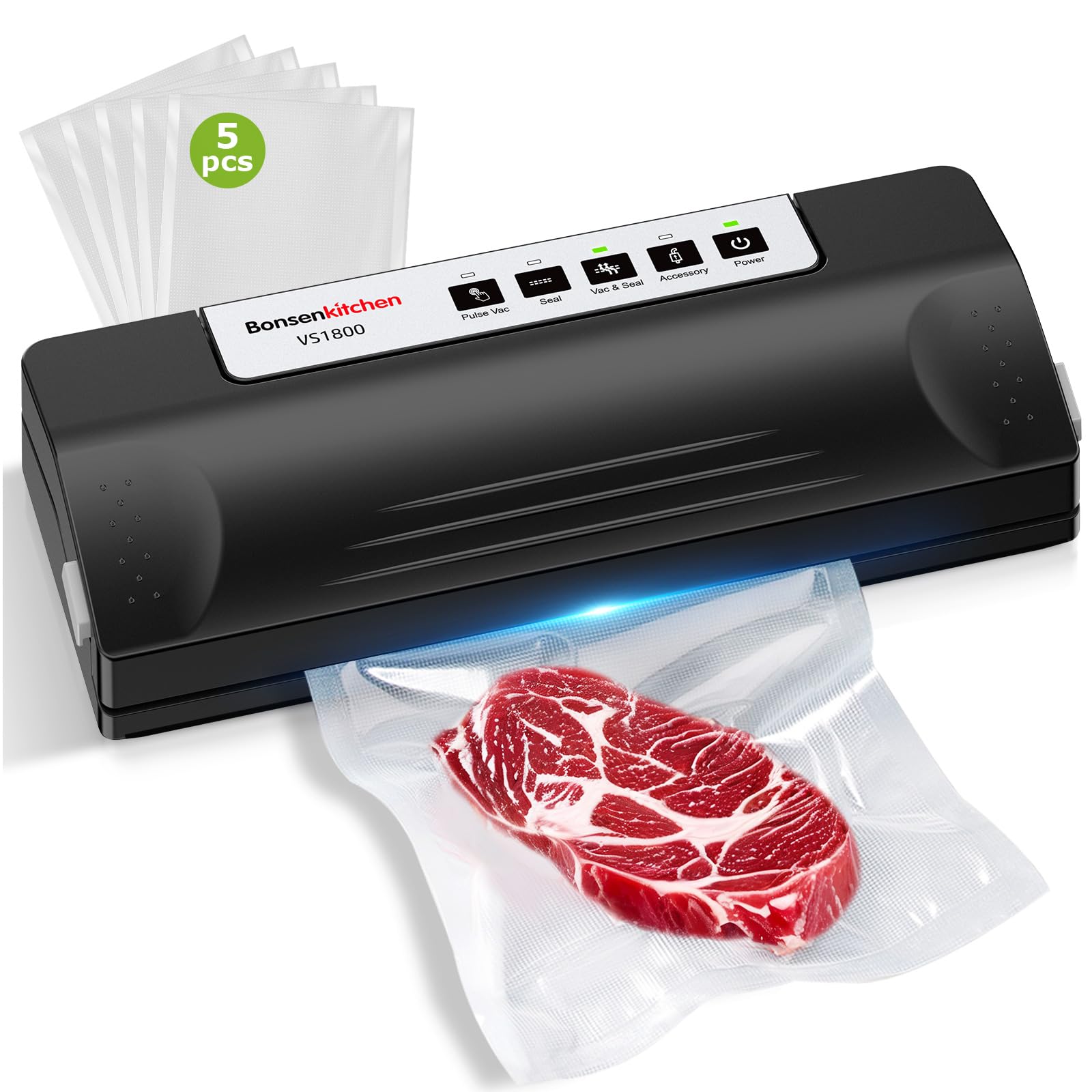 Bonsenkitchen Vacuum Sealer Machine for Food, Multi-Functional Food Sealer, Automatic Operation Mode, Commercial Grade, Compact Design, with 5 Vacuum Bags, Black-Silver
