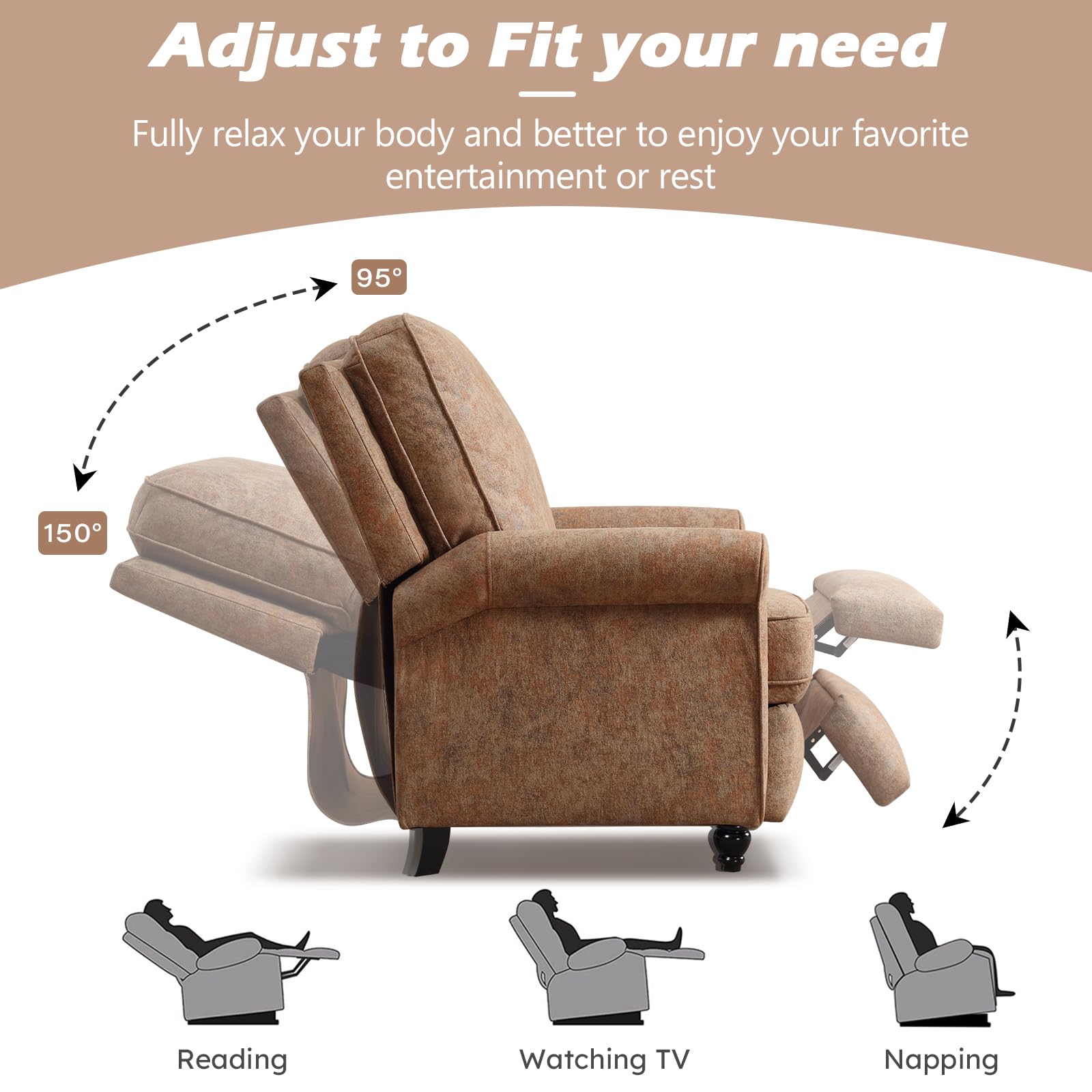 - Overstuffed Pushback Reclining Chair: Indulge in the ultimate comfort with our pushback recliner chair, wrapped in premium textured fabric that radiates sophistication and warmth. Its overstuffed design invites you to sink in and relax, while the durable upholstery ensures effortless upkeep for years to come. Crafted with FSC-certified wood, this chair not only supports your comfort but also supports the planet—because style and sustainability should always go hand in hand.