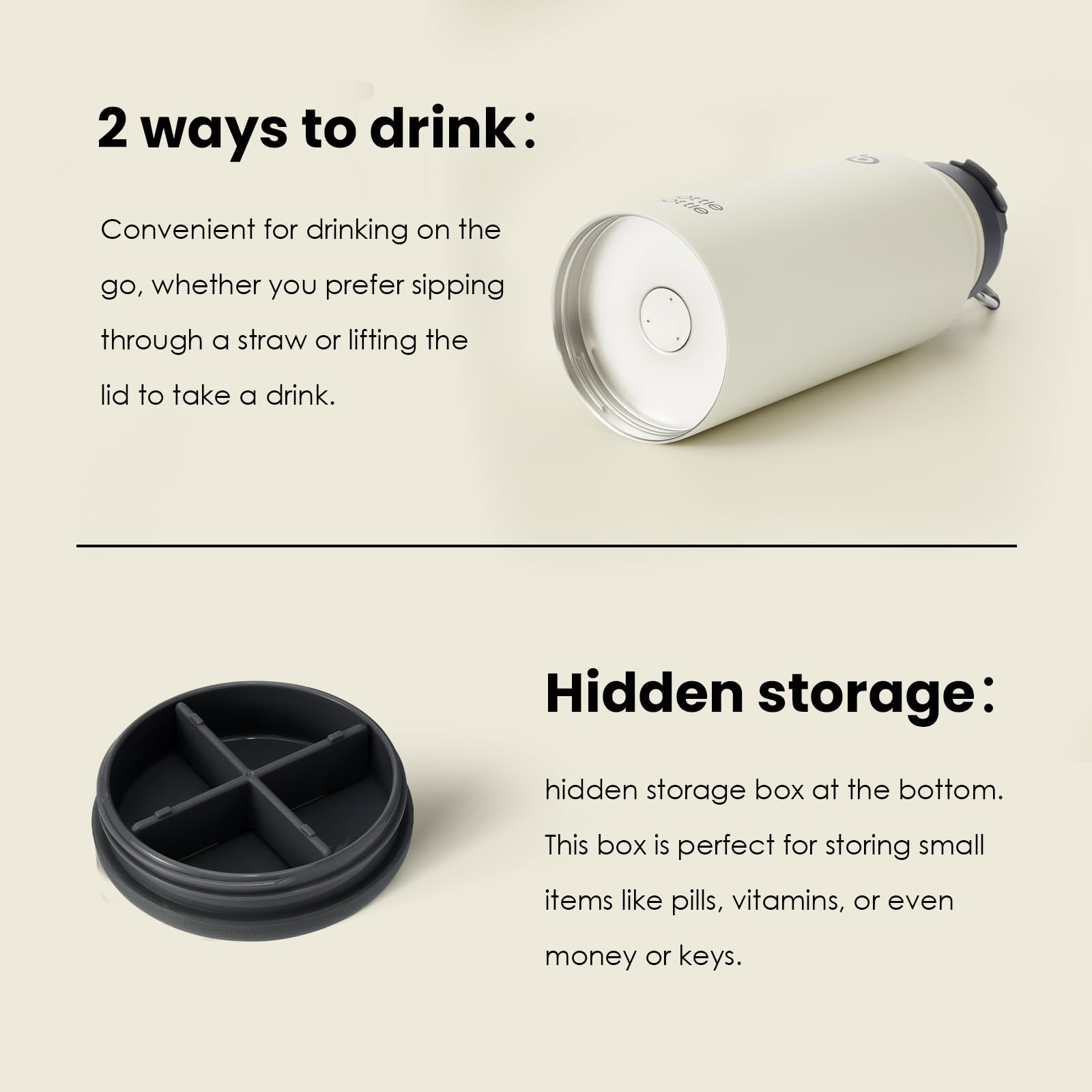 - [With Pill Box]: A storage space at the bottom of the 32 oz water bottle that can be swiveled open. You can use this space to store pills and vitamins, even coins and keys, also could be used as a pet bowl for water and snacks when on outings