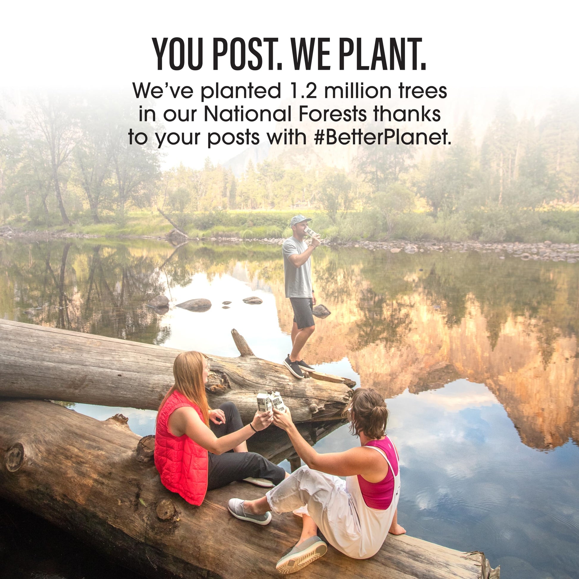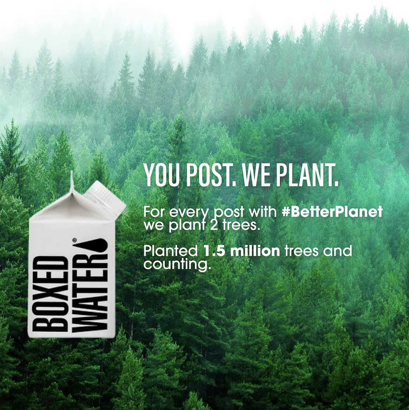 - WE HELP THE PLANET – Boxed Water obsesses over providing the purest water. We’ve planted over a million trees and counting with the National Forest Foundation. For each social media post with #BetterPlanet, we plant 2 trees.