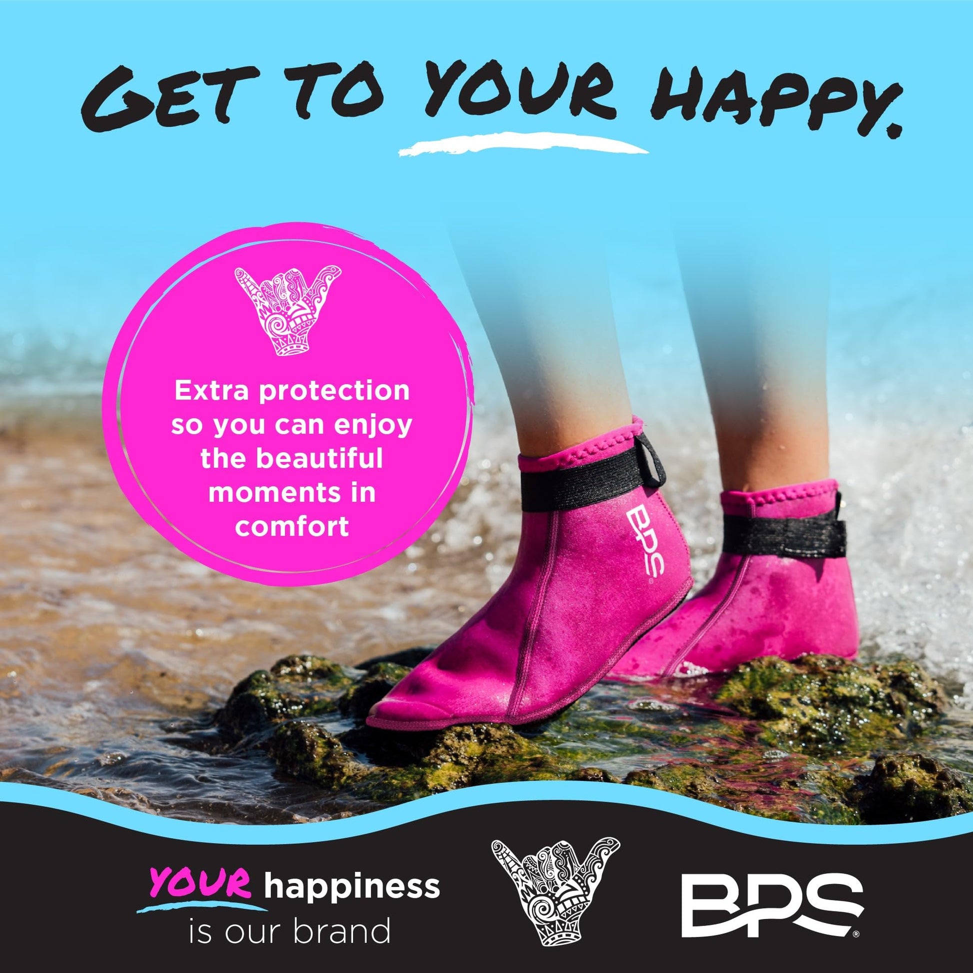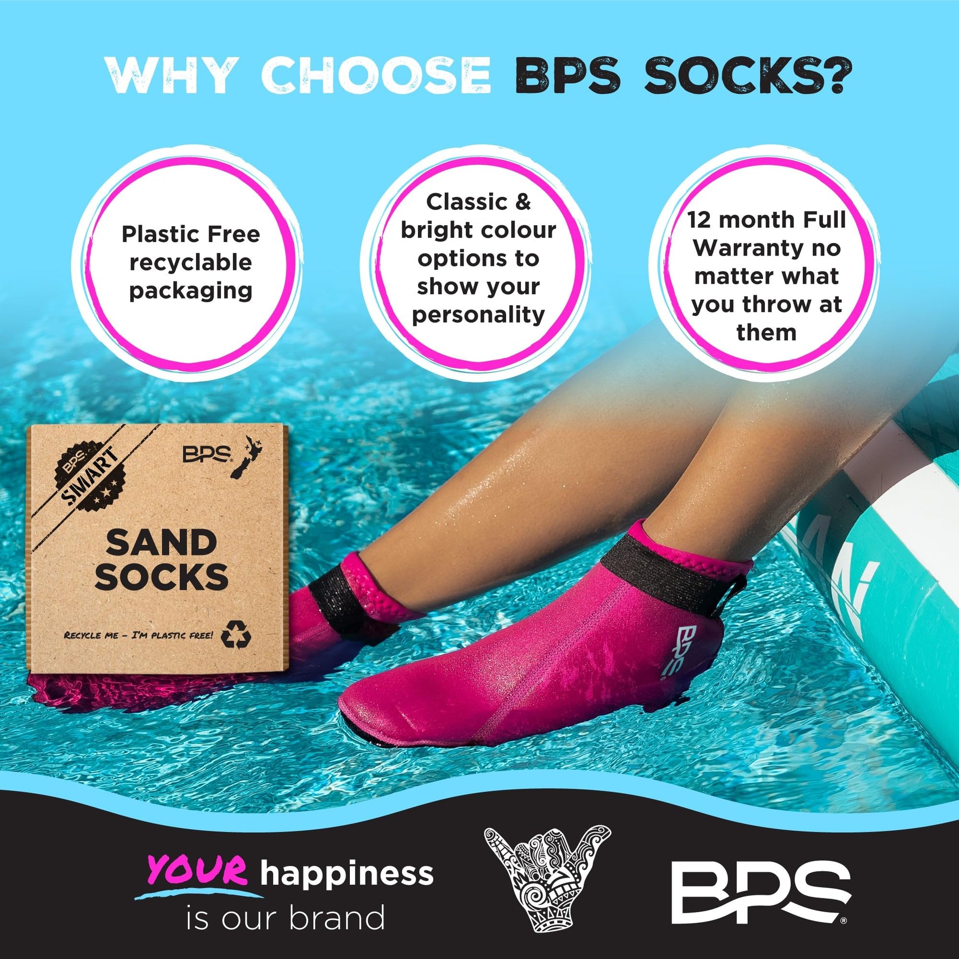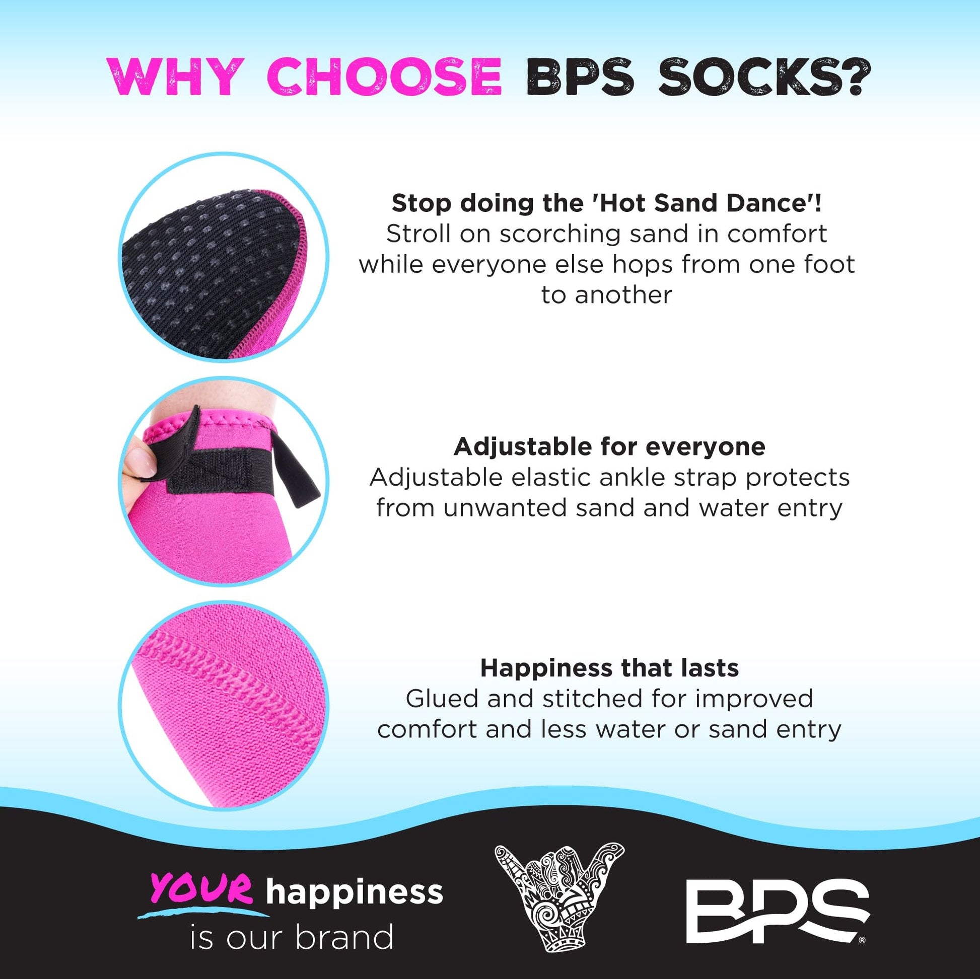 • BPS BEACH SOCKS ARE BETTER! 😃 Stop doing the hot sand dance and stroll in comfort while everyone else hops from one foot to another. Our neoprene socks flexible soles protect your feet from hot sand AND anything else you want to avoid like shells or rocks, and we’ve added adjustable elastic ankle straps to lessen unwanted water or sand entry.